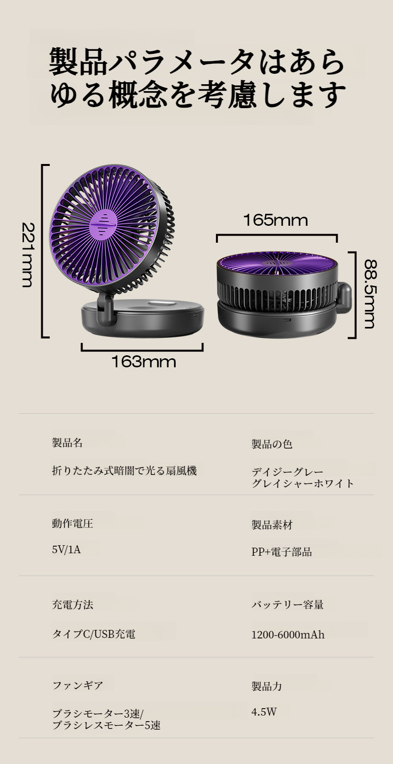 ミニ扇風機 デスクトップ 折りたたみ式 多機能ファンの全体画像